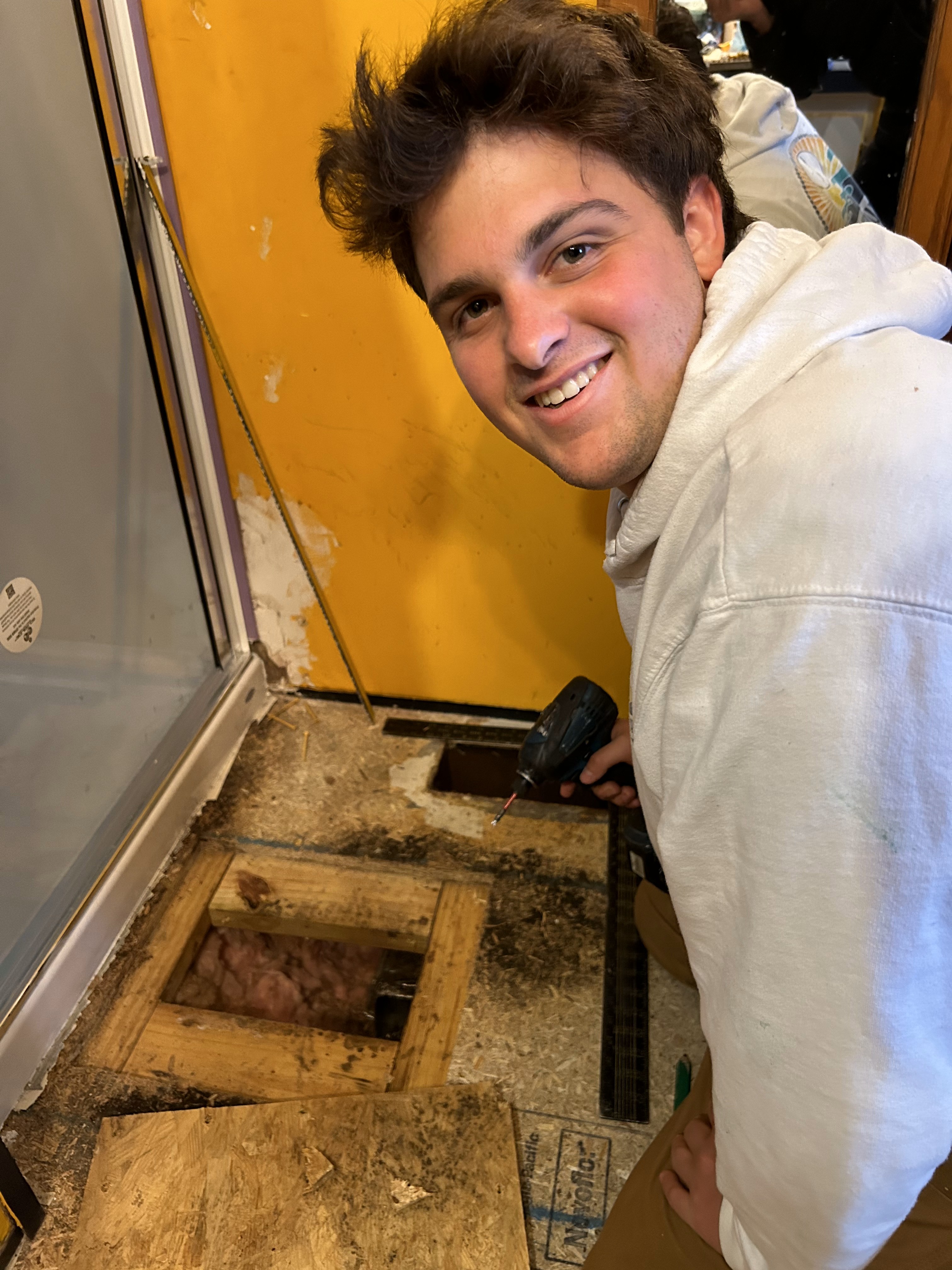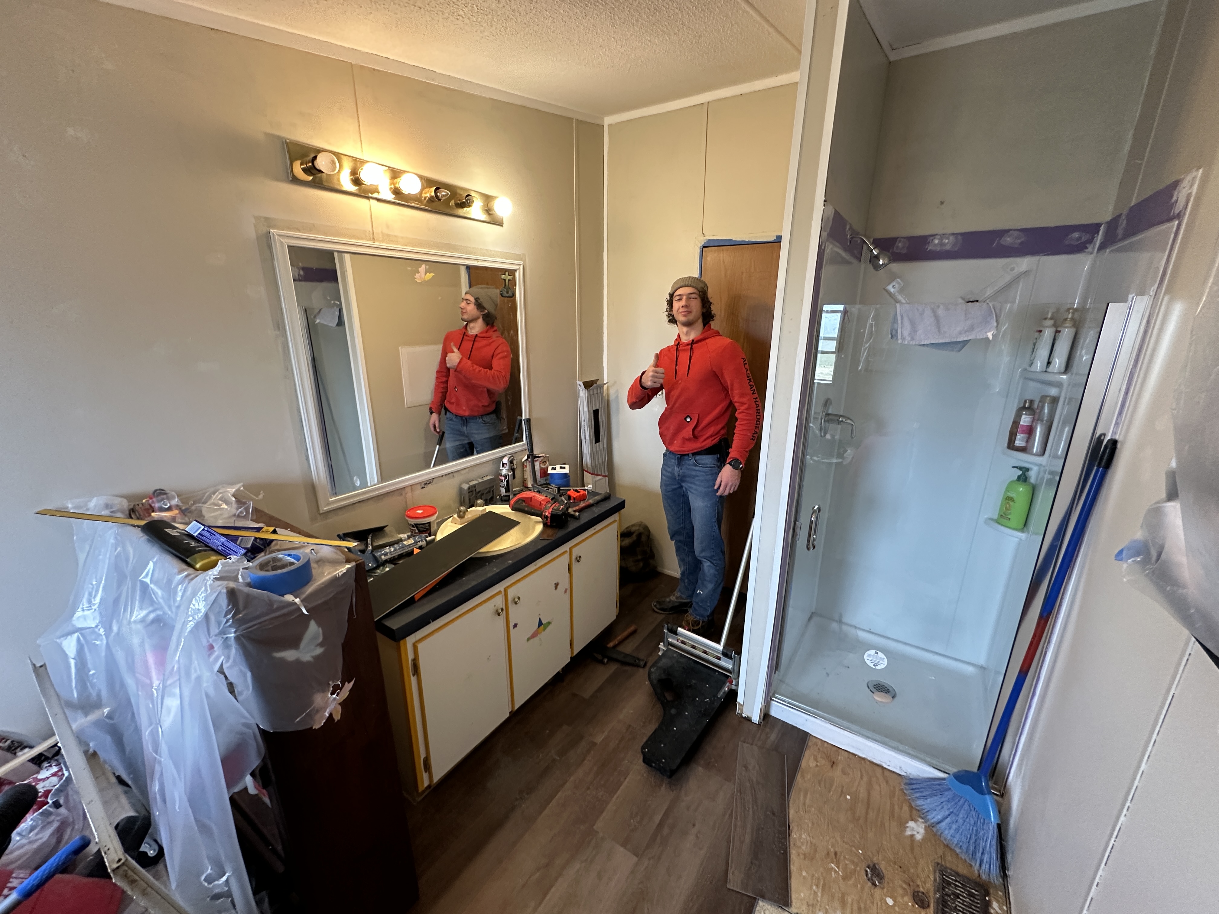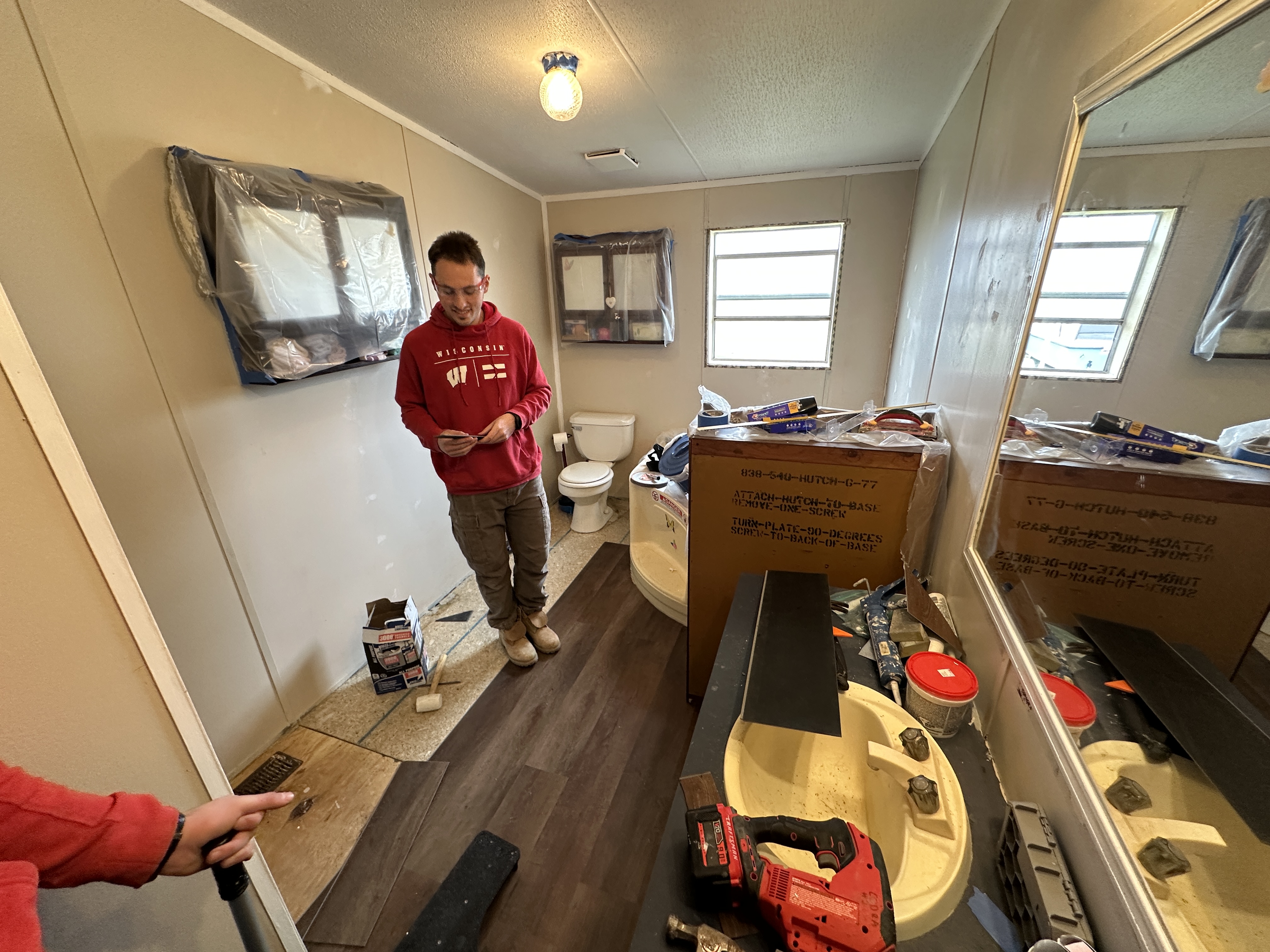 Team 1 mainly laid flooring, while Bobby Srour installed the plumbing in a bathroom.