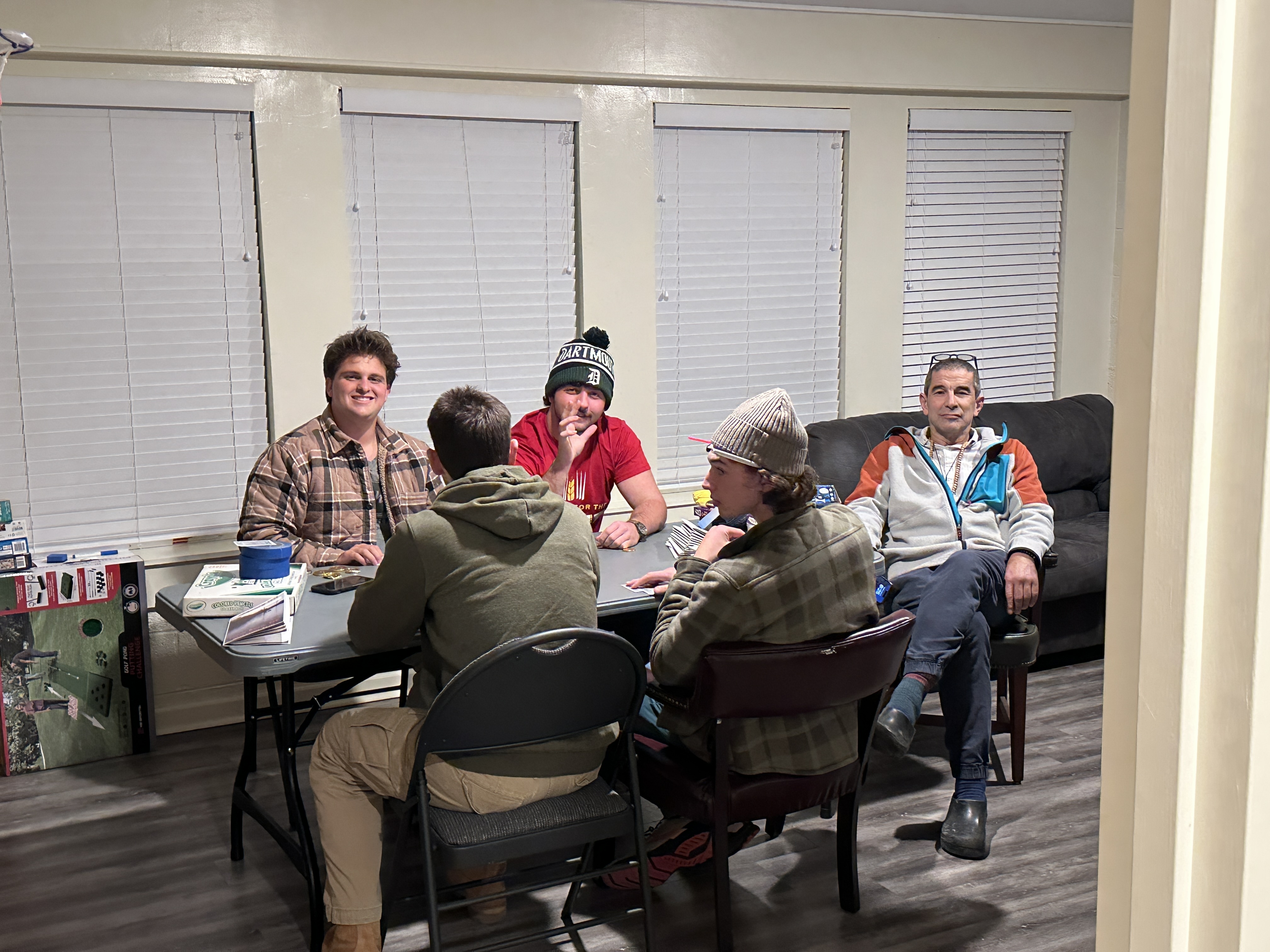 After a night of devotion, poker, and football, the team headed to bed to rest up for our first work day.